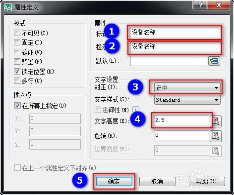 在弹出的“属性定义”窗口的【属性】框中【标记】项填写“设备名称”,【提示】项填写“设备名称”,【文字设置】框中,【对正】项选择“正中”,【文字高度】项设置合适的文字高度,其他项保持默认即可,点击确定按钮,在绘图区指定插入位置,结果如图所示。