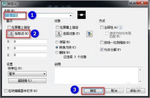 在弹出的“块定义”窗口的名称中输入“设备详情”,然后选择“拾取点”,确定块的插入基点,点击“确定”按钮退出。