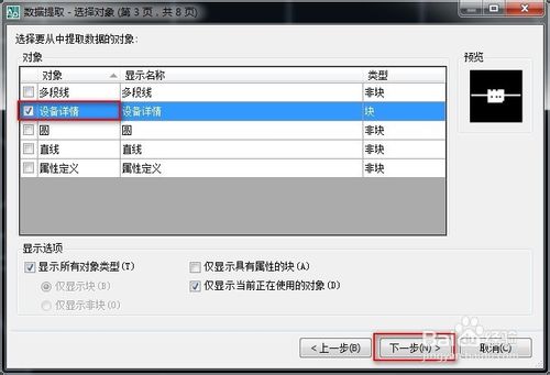 在“数据提取-选择对象”窗口中,只选择“设备详情”一项,点击“下一步”。