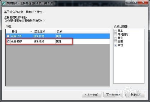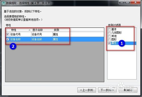 在“数据提取-选择特性”窗口中的“类别过滤器”中只选择“属性”一项,然后在左侧“特性”中选择两项,点击“下一步”。