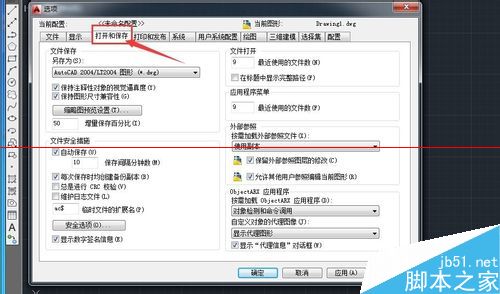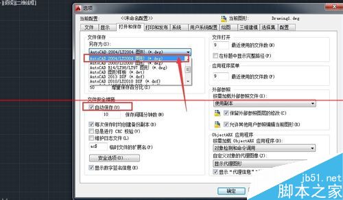 6、在左侧的文件保存方式里,一般保存的版本低一些,传资料时大家都比较容易打开,如果是高版本的,对方可能不能打开,版本比较低,不能向上兼容,还得重新转化再传,在这儿我另存成2004格式,即AutoCAD2014图形(*.dwg)。文件安全措施上,采取自动保存,每隔10分钟就要保存一次,防止停电或者其他意外情况出现