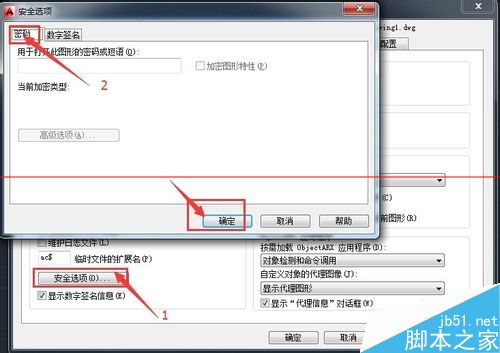 7、对于安全选项上,点开后弹出安全设置,如果设计的CAD文件是比较机密的可以用密码加密,如果只是自己看的话,就不用加了,设置完成后确定就可以了