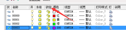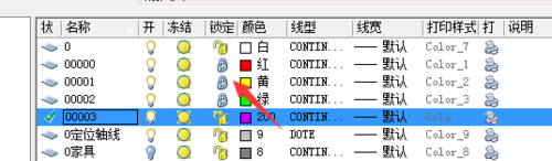 3、点击打开“图层特性管理器”后,如图所示的5个图层其中01,02,03,04图层是上面传的图片上的四种线性,下面以这四种线性为例进行介绍。