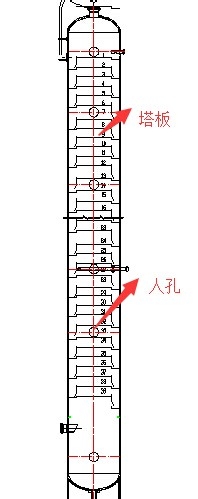 5、根据我们对塔设备的水力学和机械强度的设计校核,依次画出塔的塔板、人孔、进料口等,并对每一块塔板进行标号。