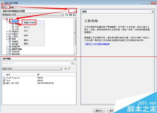 2、进入用户自定义界面,默认的是进入“自定义”、如果没有发现下图中的界面,表明界面被折叠,点击箭头所示的“折叠图标”打开即可。右键点击“工作空间”,然后点击“新建工作空间”。