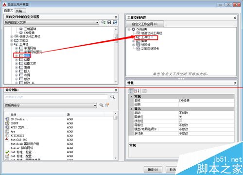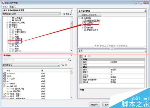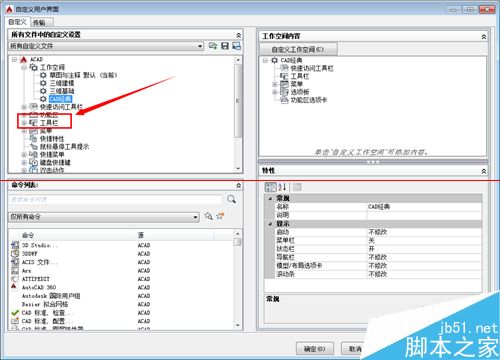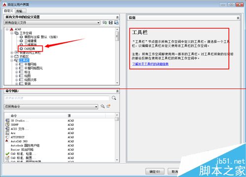 5、这时候右边显示的是工具栏的相关信息,这时候点击“CAD经典”,打开“CAD经典右方的界面。