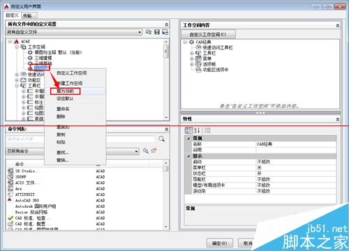 9、在左上方,右键点击刚才新建的“CAD经典”,然后选择“置为当前”。
