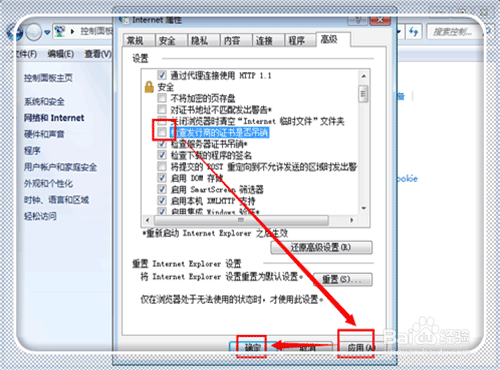 去掉“检查发行商的证书是否吊销”前面的√,点击“应用”,点击“确定”。
