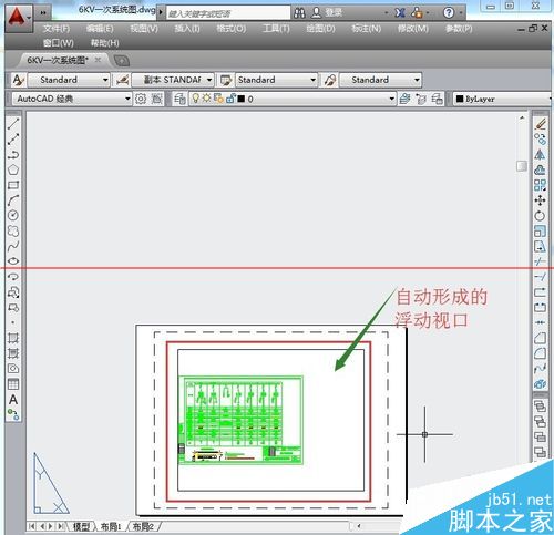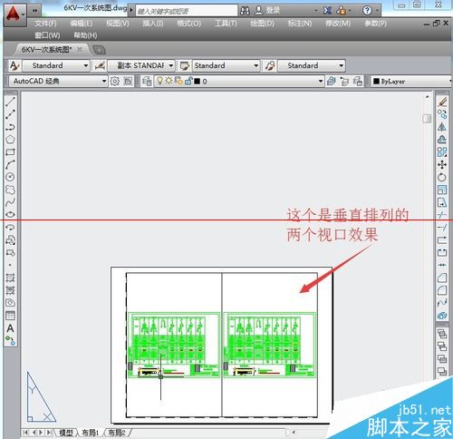 7、这个就是新创建的两个视口效果布局图,创建两个浮动视口,可以一个中显示 整个图形,在另一个显示部分图形