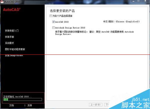 3、点击“安装产品”位置,出现新的界面,选择如下第一图,点击“下一步”,出现新的界面,其会提示“正在初始化AutoCAD2010”,如下第二图;