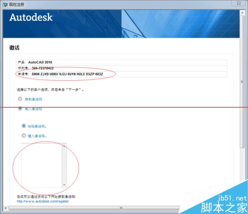 2、最后点击”启动AutoCAD2010“,会出现提示”激活“的窗口,并点击”激活“栏,会出现新的界面,找到申请号,如下图: