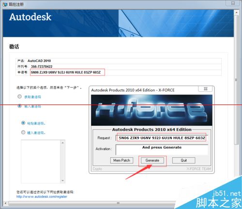 5、点击“Generate”,在Activation那栏会出现产品“激活码”,将该激活码复制并粘贴到软件激活界面中的输入处,如下图所示: