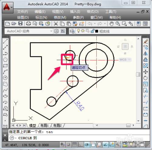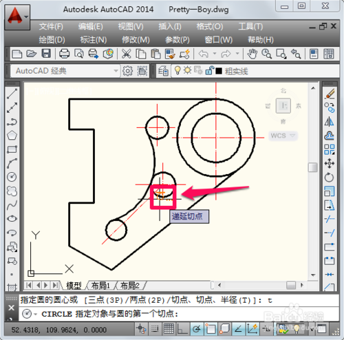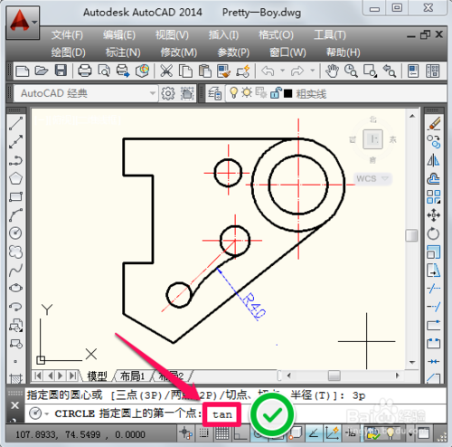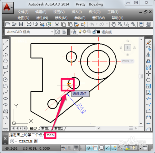 5、同上面方法一样,接着输入“tan”,在第2个圆上捕捉切点。