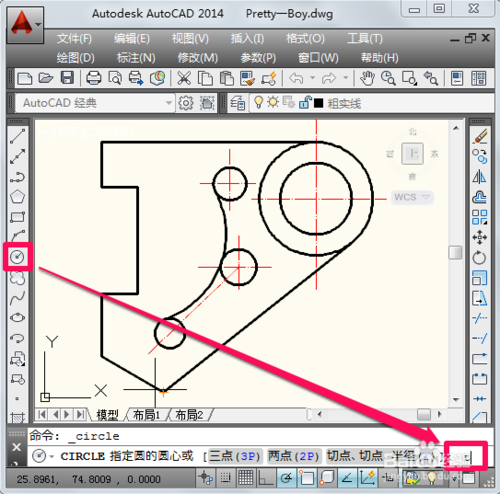 2、选择圆形工具,然后在命令行输入“3p”(也就是利用3点画圆),按回车确定。