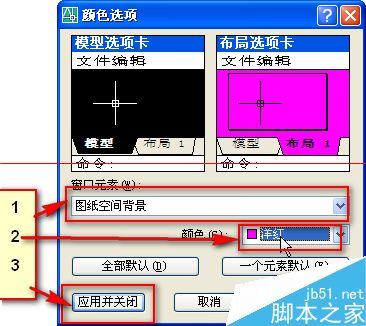 4、在打开的对话框中,选择窗口元素为图纸空间背景,并修改成想要的颜色(此处修改为粉色),然后单击应用并关闭。