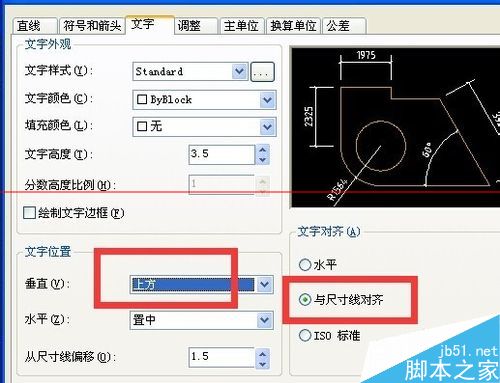 5、文字位置选择“上方”,文字对齐方式选择“与尺寸线对齐”如图所示。