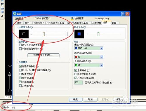 也可以手动输入命令“op”,回车。就能跳出“选项”框进行“拾取框大小”的调节。