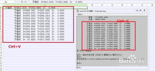 第二步:将CAD文本框中的数据复制到Excel中。选中文本框中的有效数据”Ctrl+C“,在打开的Excel中”Ctrl+V“。