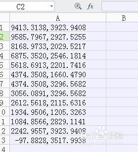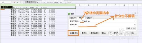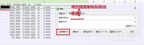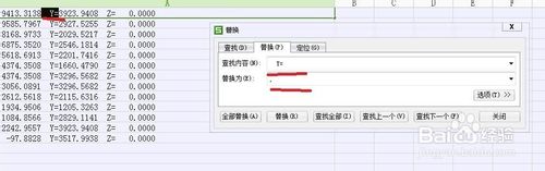 第三步:用Excel”替换“命令删除不必要文字和空格。选中文本所在单元格。点击”开始“右侧的“替换”(或者”编辑“——”替换“)。选中第一格X坐标前的所有部分。复制粘贴到”查找内容“中。“替换为”什么也不用填。点选“全部替换(A)”。发现此时格式还是有些别扭。所以还要再进行几步上述操作,将如第二行一样格式文本中多余的空格删掉。