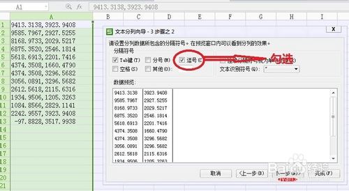 第四步:数据分列。选中文本所在列。选择“数据”——“分列”———“下一步”——勾选“逗号”——“下一步”——“完成”。