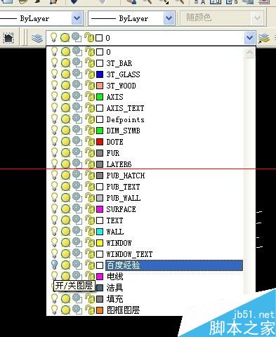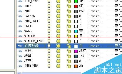 1、如图所示我们要将CAD中“百度经验”这个图层删除。