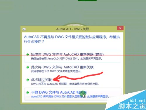 2、如果你的电脑中有DWG格式的图形(用CAD低版本绘制的图形),CAD2016软件会弹出“DWG将不与AUTO CAD”关联这样的信息,此时点跳过即可;