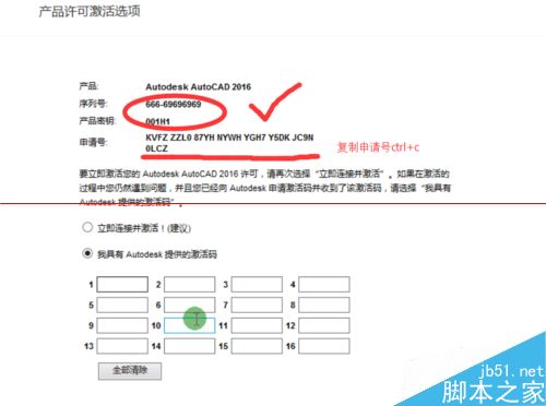4、在产品许可证激活选项中,会提示有激活的序列号及激活码,选中激活码对其进行复制;(要使用快捷捷ctrl+c对其进行复制)
