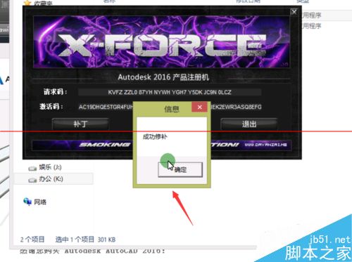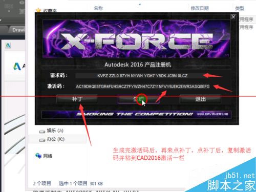 5、打开所下载的CAD2016激活码生成软件,我电脑是64位系统的,选择的是64位;打开后的软件界面如图2;把刚才复制的激活码复制到请求码一栏,然后点生成;接着再来点补丁;在点过补丁后,其弹出成功修补信息提示,如图3;