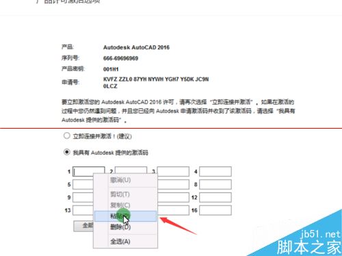 7、把界面切换到CAD2016产品激活界面,然后点开我具有autodesk提供的激活码;如图1,粘贴完成后如图2;