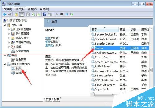 2、来到计算机管理界面,在左侧栏找到“服务”并点击,在右侧栏中通过拖动滚动条找到“Server”服务,并确定已经设置为自动启动。如果没有请设置为自动启动。