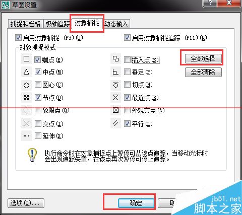 3、然后在对象捕捉里面,将所有的捕捉点都打开,如图所示