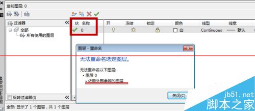 3、里面有一个cad默认的图层,我们是没有办法修改的,大家可以自己试下,双击修改它的名称,它会提示这个是我们”依赖外部参照的图层“