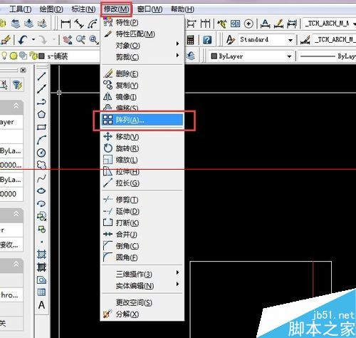 2、首先调出来阵列的命令,修改——阵列(或者是快捷键ar),如图所示