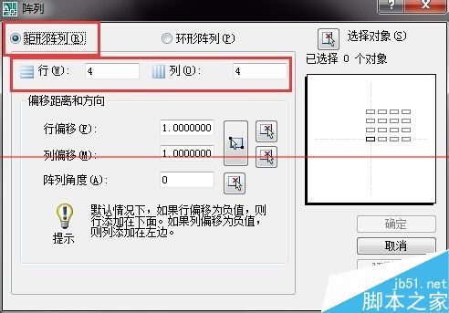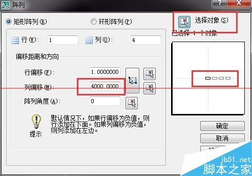 3、因为小编画的是竖线,所以说小编阵列列,在行里面天上1即可,在列里面填上你要阵列的列数,比如说小编阵列的4列,填上四列,还有阵列的间距,然后点击选择对象,如图所示