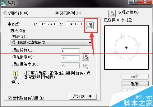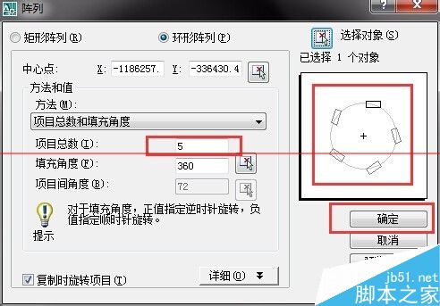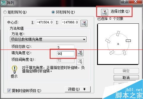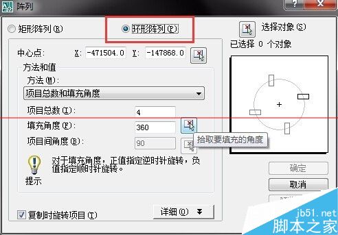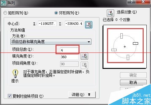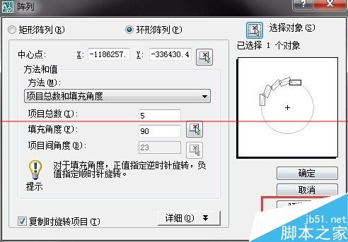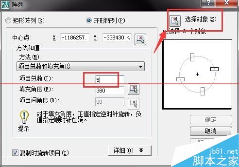 4、之后调节项目数,项目数就是你要阵列多少条红色的线条,右边有预览(一般预览是在选择完对象之后才能看到),可以看到阵列的方向,之后选择对象,如图所示