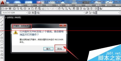 2、打开后 ,结果软件弹出打开图形,发现错误的页面提示,打开图形文件时发现两个错误,如果取消此次操作,那么就选择是