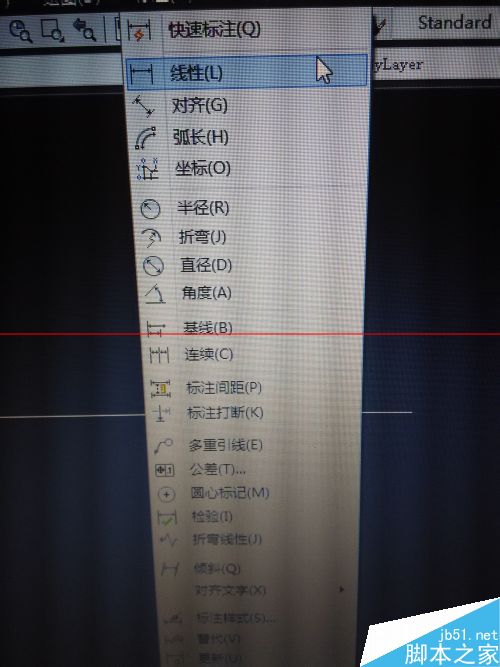 4、点击上方的“标注”按钮,出现如下图所示,点击“线性”按钮。