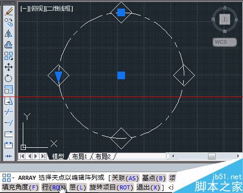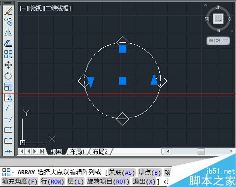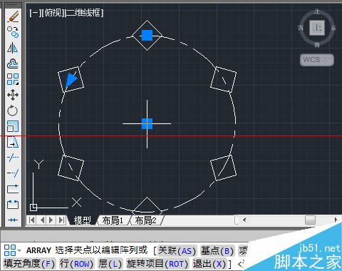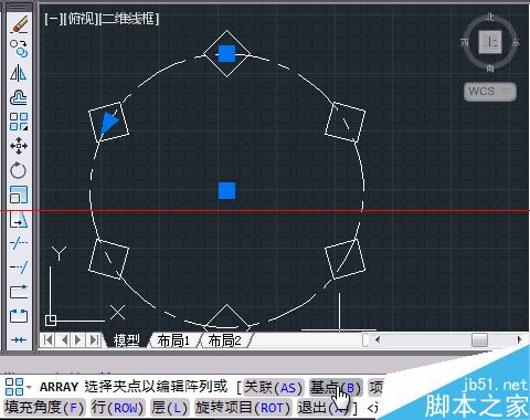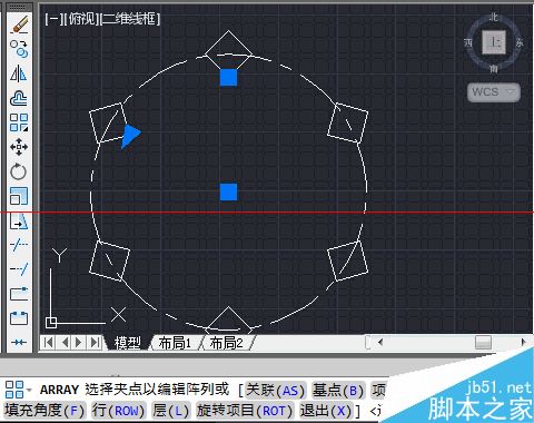 4、上一步中心点选定后,绘图区域显示了在辅助圆周上,均匀地分布着6个正方形。命令栏出现了“选择夹点以编辑阵列或 [关联(AS)/基点(B)/项目(I)/项目间角度(A)/填充角度(F)/行(ROW)/层(L)/旋转项目(ROT)/退出(X)]”的指令。