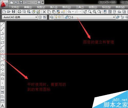 1、首先你需要打开2010版cad,打开之后的界面如图所示。在左边的各种图标是画图常用的图标,比如第一个就是直线的图标,单击图标之后就可以执行相应的操作。在画图时,因为需要,要建立不同的图层,这是就需要建立图层和管理图层了。