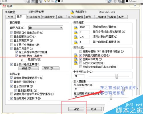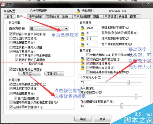 3、单击选项项目之后,找到显示并单击,单击之后会出现如图所示,有窗口元素,布局元素,显示精度等,十字光标大小是可以改变光标得大小,单击窗口元素中的颜色选项,并单击。