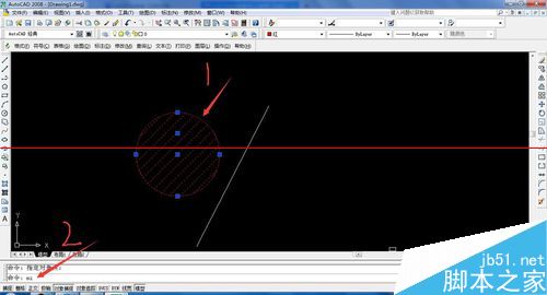 3、选中需要进行镜像操作的原始图形,选中后图形会变成虚线(写了1的地方),接着就是在命令输入栏输入镜像的快捷键 mi 然后回车