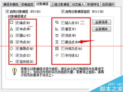 TT 临时追踪点 FROM 从临时参照到偏移 ENDP 捕捉到圆弧或线的最近端点 MID 捕捉圆弧或线的中点 INT 线、圆、圆弧的交点 APPINT 两个对象的外观交点 EXT 线、圆弧、圆的延伸线 CEN 圆弧、圆心的圆心 QUA 圆弧或圆的象限点 TAN 圆弧或圆的限象点 PER 线、圆弧、圆的重足 PAR 直线的平行线 NOD 捕捉到点对象 INS 文字、块、形、或属性的插入点 NEA 最近点捕捉
