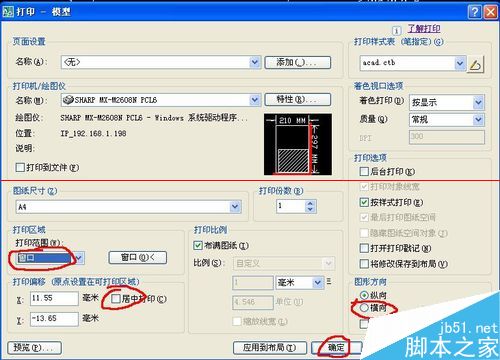 4、在打印范围中选择“窗口”。在图纸尺寸选择你想要打印多大的纸张。我选的A4纸张。