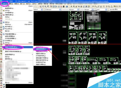 1.打开CAD,将准备打印的2D图纸打开,点击左上角的文件,将鼠标移至批量打印实用工具里面的批量生成布局选项,点击进入。