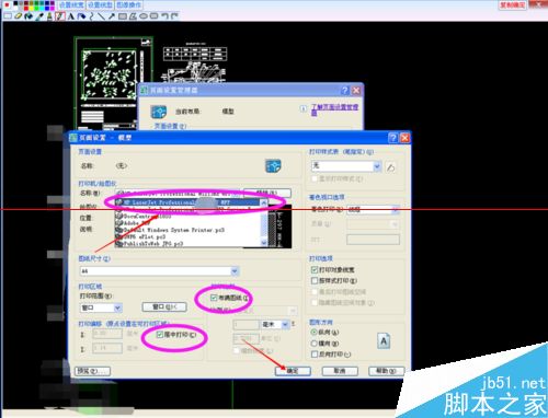 2.找到打印机设置选项,点击进去,选择你电脑连接的打印机驱动名称并选择,然后将布满图纸,居中打印及打印线宽的选项勾勾上,点击确定。