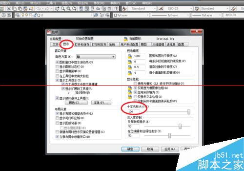 第三步,点击完工具按钮后会出现新的对话框,在新对话框界面点击显示按钮,这时你会看到界面右下方会出现十字光标大小的选项,看到后将其数值改为100。(100代表十字光标是满屏的,具体数值根据每个人的作图习惯)。