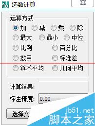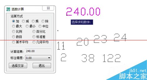 3、选择自己需要的一种计算方式,有加减乘除等计算方式可供选择,然后选择需要计算的数字文字。点确定可以自动计算出来,并且可以在当前图标注出来。