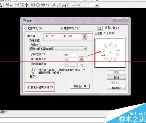 注意事项:阵列的角度设置,正值:逆时针方向环形阵列该图形,负值则相反。