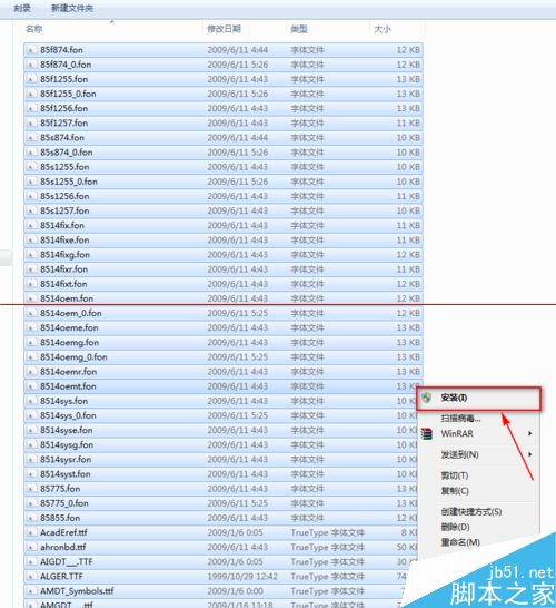 4、将下载的常用的Windows字体文件解压后,全部选中,然后右键选择“安装”,将字体安装到Windows文件夹下的Fonts文件夹下