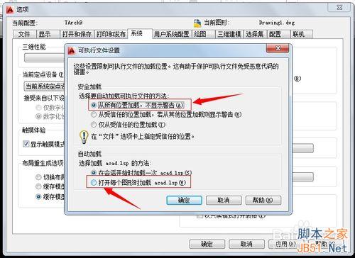 点击打开具体设置,首先选择第一个“从所有位置加载,不显示警告”那么以后所有加载信息不再显示安全提示,还有图纸在加载的时候会自动加载图纸的acad.lsp文件,如果以后也不需要提示那么就把下面红色框前面的选项选中,如图所示: